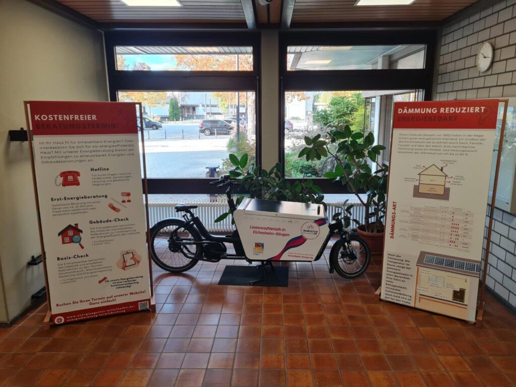 Informationen über Dämmung und Lüftung, sowie die Übersicht über das kostenfreie Beratungsangebot der Energieagentur können Sie neben dem Lastenrad entdecken.