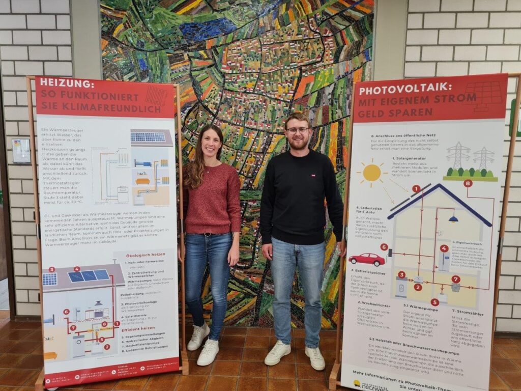 Tanya Ganzhorn und Julian Semling haben die Wanderausstellung im Eingangsbereich aufgebaut. Die Themen Heizung und Photovoltaik finden Sie neben dem Bürgerbüro.